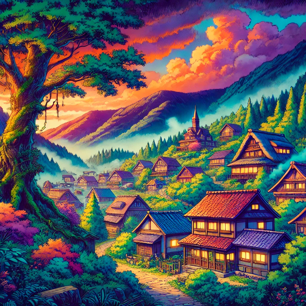 - "A cozy town in the mountains, Ghibli-style, warm light, hand-drawn look"