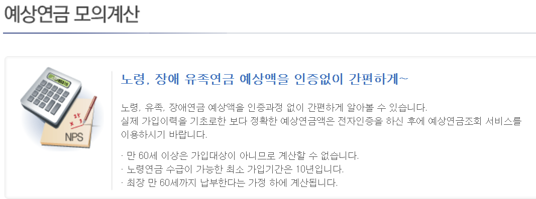 노령, 장애 유족연금 예상액을 인증없이 간편하게~ 노령, 유족, 장애연금 예상액을 인증과정 없이 간편하게 알아볼 수 있습니다. 실제 가입이력을 기초로한 보다 정확한 예상연금액은 전자인증